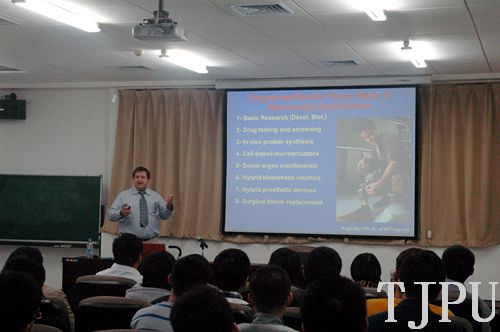 应我校机械工程学院邀请,美国北卡罗来纳大学Robert Dennis教授于10月13日—16日到我校进行了学术交流访问。 10月14日下午,Robert Dennis教授在机械学院学术报告厅面向学院全体研究生作了题为“Overview of Current State of The art in Tissue Engineering”的学术报告。Dennis教授在报告中系统讲述了组织学机理研究应用于肌肉、心脏、大脑等方面的研究成果,以及当前国外组织工程领域现状。报告由机械学院副院长李亮玉教授主持。 10月16日下午,Robert Dennis教授在机械学院学术报告厅作了题为“BME System Development:Concept to Commercialization”的专题报告。报告中,Dennis博士结合自身教学科研经历,围绕生物医学工程发展及国外前沿动态、知识产业化进程、数字医药(Digi- ceutical)应用于干细胞(Stem Cell)生长等方面的内容进行了详细阐述。报告涉及生物医学、工程力学、材料科学等诸多学科研究领域。报告由机械学院院长金国光教授主持,机械学院副院长李亮玉、副书记杜玉红,学校相关专业领域师生80余人参加了活动。会场学术氛围浓烈,互动环节,参会人员分别就自己感兴趣的问题与Robert教授进行了积极交流,纷纷表示受益匪浅。 访问期间,国际交流处处长姜亚明,机械学院党委书记温淑鸿、院长金国光,副院长李亮玉、杨涛会见了Robert Dennis教授一行。Dennis教授与机械学院领导班子成员、机械电子工程系、测控技术与仪器系、工业设计系、机械制造及自动化系及电信学院生物医学工程系等系主任,就学生赴美短期交流、全英文授课专业建设及教师学术交流等事宜进行了座谈。访问过程中,Dennis教授还在杨涛副院长的陪同下,参观了机械工程学院机器人实验室、机电传动实验室、机械基础实验中心、机械制造加工中心等十余个实验室,并对机械学院实验室建设及仪器设备应用于本科教学给予了高度评价。国际交流处副处长张兴国全程陪同并担任翻译。 Dennis教授毕业于美国密歇根大学,生物医学工程博士,现任美国北卡罗来纳大学教堂山分校终身教授。曾系美国密歇根大学Ann Arbor分校功能组织工程实验室(FTEL)总负责人、创始人,埃及Alexandria大学组织工程实验室客座教授,美国麻省理工学院人工智能实验室、生物机电工程组访问学者。先后发表学术论文100余篇,获得多项技术专利。(编辑:宣传部 谢光勇)