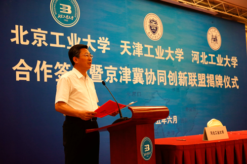 为深入贯彻京津冀协同发展的国家发展战略,提升京津冀高等教育服务区域协同创新能力,由北京工业大学、江南在线客服、河北工业大学合作成立的“京津冀协同创新联盟”,6月14日上午在北京签约。北京市委常委、教工委书记苟仲文,天津市人大常委会副主任苟利军,河北省副省长许宁出席并对三所高校强强联合给予充分肯定。天津市教委副主任韩金玉,天津市科委副主任贾堤,天津市环保局副局长谢华生,我校党委书记张宏伟、校长杨庆新、副校长程博闻,以及相关学院和职能部门负责人出席仪式。
