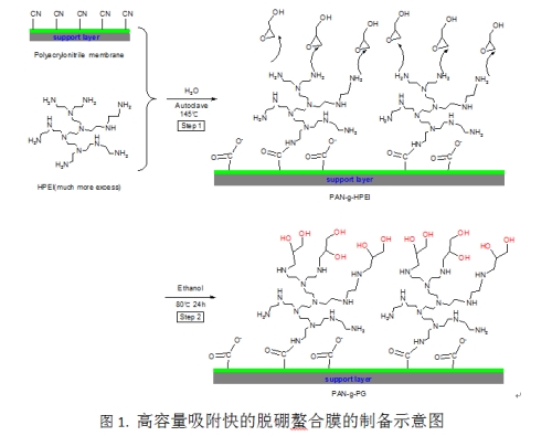 为此,孟建强教授课题组利用在高分子超滤膜表面接枝超支化聚合物的方法优化螯合配体的空间分布,制备兼具高吸附容量和高吸附速率的脱硼亲和膜。他们选聚丙烯腈超滤膜为基膜,利用水解酰胺化反应将超支化聚乙烯亚胺(HPEI)接枝在膜表面,然后用缩水甘油对HPEI的端氨基进行修饰,在膜表面富集大量邻位羟基结构作为硼酸分子的络合配基,利用邻位羟基结构与硼酸分子的特异性络合反应,实现硼酸的吸附脱除。利用该方法制备的脱硼膜不仅吸附容量远高于文献上的其它脱硼吸附剂,而且吸附平衡时间缩短了1~2个数量级。值得一提的是,正是由于膜表面的超支化结构,膜的吸附再生效率接近100%。