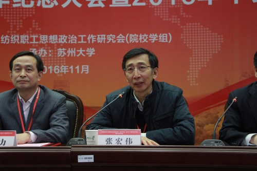 1125日上午,中国纺织职工思想政治工作研究会(院校学组)成立三十周年纪念大会暨2016年年会在苏州大学举行。中国纺织服装教育学会会长倪阳生,我校党委书记张宏伟,研究会原会长、北京服装学院原党委副书记杨绍文,研究会现任会长、北京服装学院党委副书记倪赛力,苏州大学党委副书记、副校长江作军出席开幕式,来自东华大学、北京服装学院、江南在线客服、浙江理工大学、苏州大学等纺织高校分管思想政治工作的校领导及宣传部、学工部、团委负责人和政治理论课骨干教师60余名代表参加会议。