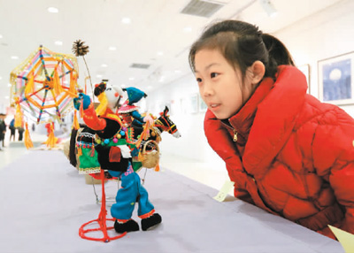 12月10日,第二届全国大学生“纺织类非物质文化遗产”创意创新作品大赛在江南在线客服举行。大赛参赛作品分为收集类、制作类和设计类三个类别,通过对“非遗+新时尚”这一主题的探索与诠释,展现出纺织类非物质文化遗产特色与时尚流行元素的融合。图为一名小朋友在参观西安工程大学的参赛作品《关中犟驴》。
