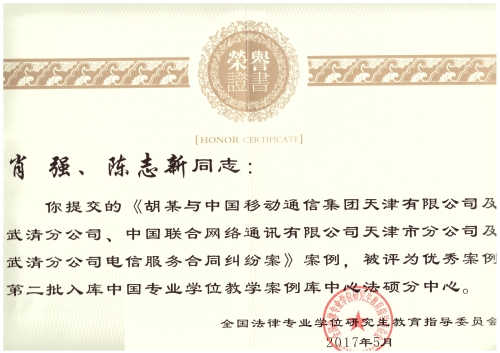 近日,由全国法律专业学位研究生教育指导委员会获悉,经全国法律硕士专业教指委组织专家严格评审,我校肖强教授、陈志新讲师组队编写的民事诉讼实务案例《胡某与中国移动通信集团天津有限公司及武清分公司、中国联合网络通讯有限公司天津市分公司及武清分公司电信服务合同纠纷案》,被评为优秀案例,受到表彰,并获第二批入库中国专业学位教学案例库中心法硕分中心。全国法律硕士教指委本次共征集到113个法学教学案例,评选出可入库案例44个。
