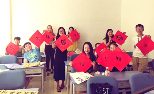 2017年7月1日,短期班留学生们分班进行了中国传统文化体验,剪纸、中国结制作、书法等活动异彩纷呈。中国书法体验受到了留学生们的热烈欢迎,老师从毛笔的握笔方法、楷书的基本笔画开始讲起,以著名的“永字八法”为切入点,深入浅出,循序渐进。“和、福、友、爱、心”是留学生们最喜欢练习的几个汉字,老师一边向留学生传授书写的技法,一边介绍中国书法中文字的结构和组合所蕴藏的深刻内涵。留学生们一笔一划认真临摹,兴趣盎然。
