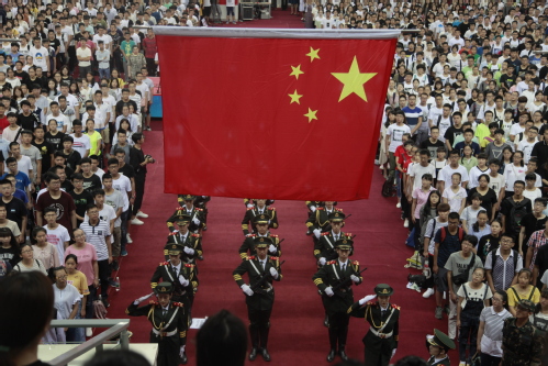 现场举行升旗仪式。学校国旗班迈着整齐的步伐护卫着国旗步入会场。全场肃立,奏唱国歌,在全体师生的注目中,国旗缓缓升上杆顶。