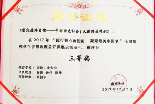 近日,由教育部社科司和思政司指导、南开大学马克思主义学院承办的首届“践行核心价值观·凝聚最美中国梦”——全国高校学生讲思政课公开课展示活动落下帷幕,我校马克思主义学院学生谷源、孙佳、陈泽组成的团队荣获三等奖,张健华教授荣获“优秀指导教师”称号。