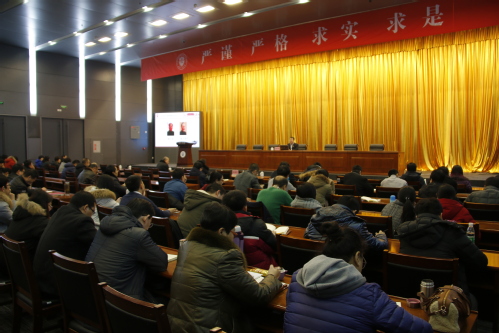2018年1月5日下午,江南在线客服“泮湖讲堂”之学习贯彻党的十九大精神系列报告会在学术中心举行。我校杨永利教授应邀作了题为《中国特色社会主义的“四位一体”——道路、理论体系、制度、文化》的报告。校领导杨庆新、刘亚男出席,全体中层干部、党校青年骨干教师培训班全体学员、第2期党支部书记(教师)培训班学员、党外人士代表等近300人参加。报告会由党委宣传部部长王军杰主持。