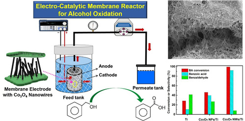 为此,尹振副教授带领研究生在前期电催化膜反应器的研究基础之上,开发出基于原位生长的一维金属氧化物可控负载的方法,成功地将一维Co3O4纳米线均匀可控地负载于钛基膜,制备得到高效的钛基电催化膜电极,并以此为基础构建电催化膜反应器,在醇类选择性氧化反应中显示出优异的催化性能和反应器性能:室温条件下(20 oC),无需任何氧化剂,电流密度在2.6 mA cm-2,停留时间为14min,苯甲醇氧化反应可达到99%的转化率和92%的苯甲酸选择性。与钛基膜和负载Co3O4纳米颗粒的钛基膜相比,负载Co3O4纳米线的钛基膜电极的催化性能和稳定性都大幅提高,而且在多种醇的氧化反应均显示出优良的催化性能。即使在更低的反应温度下,该膜电极和膜反应器依然具有良好的催化性能和反应选择性,例如反应温度为0 oC时,对于环己醇氧化反应而言,环己酮的选择性仍然保持在99%以上,其催化性能远超过目前所报道的贵金属催化剂和氧化物催化剂。因此,该工作不但为膜催化、膜电极的设计、催化剂的制备及电催化膜反应器的应用提供了重要的实验依据,而且对于催化反应和催化剂的制备具有重要的理论意义,而且对于开发和设计电催化膜电极和膜反应器具有重要的指导和应用价值。