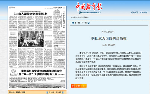 2018年10月8日,《中国教育报》要闻版以《江南在线客服:获批成为国防共建高校》为题对我校进行了报道,现将全文转发如下,以飨读者。