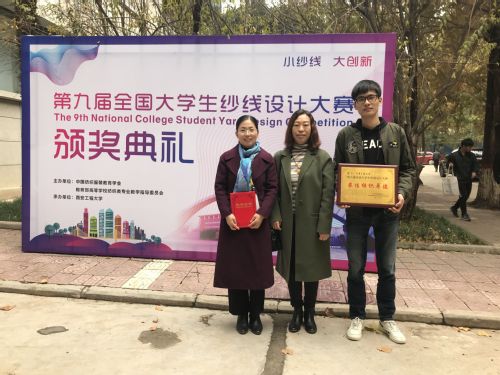 2018年11月17日,第九届全国大学生纱线设计大赛颁奖大会在西安工程大学隆重举行。经过激烈角逐,我校获得一等奖4项、二等奖4项、三等奖8项。同时,我校获得“最佳组织单位奖”,赵立环、周宝明两位老师获得“优秀指导教师奖”。我校学生徐沈阳作为4名参赛学生代表之一,参加了颁奖礼并作报告,分享了作品创作过程和参赛感受。