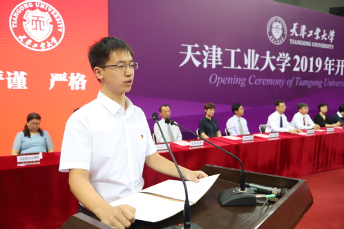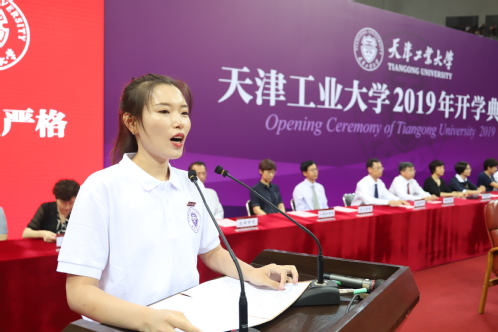 经济与管理学院孙铭浛代表研究生新同学发言,她分享了自己在西部支教的经历,并表示,将时刻谨记天工校训,努力弘扬学校精神,做一个有理想有担当的天工大人。