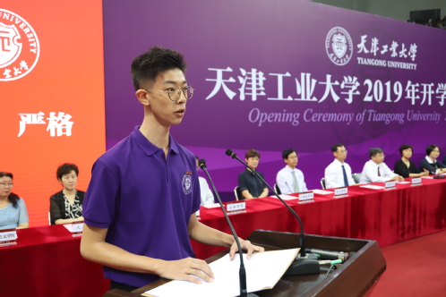 数学科学学院赵泽宁代表在校生发言,他希望新同学能够守护初心,勇敢地追逐梦想,在天工大,都能够拥有扬在脸上的自信、长在心里的善良、融进血液的骨气和刻在生命的坚强。