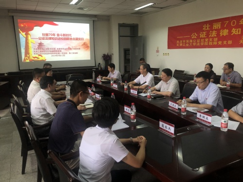 2019年9月12日下午,我校法学院教师党支部、法学本科第一学生党支部、法学本科第二学生党支部与天津市滨海公证处党支部、天津市司法局立法一处党支部开展了“壮丽70年 奋斗新时代”——“公证、法律知识进校园”联合主题党日活动。法学院全体班子成员参加活动,天津市司法局党委委员李建华副局长、我校党委常委王晨亮副校长分别深入所联系党支部参加联合主题党日活动。