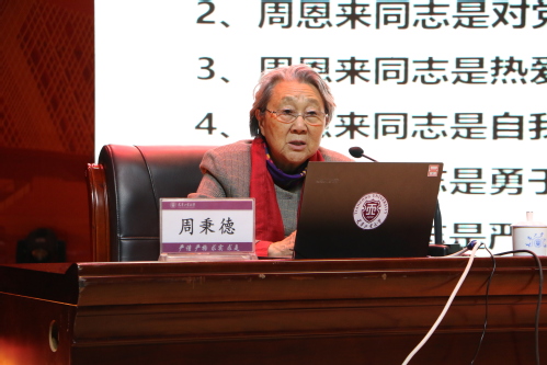 周秉德先生以亲人的独特视角,用一幅幅珍贵的历史照片与亲身经历,以家风为主题,饱含深情地讲述了周恩来总理与邓颖超同志的革命情感,周恩来总理生活简朴、公私分明,教育亲属不可特殊化,国家利益为上、热爱祖国和人民的点点滴滴。讲到情深处,周先生数度哽咽,整场讲座持续近两个半小时,现场师生多次自发响起持久的、热烈的掌声。