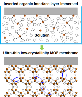目前,MOF超薄膜主要在无机或金属支撑体上制备,限制了其工业应用。本工作提出了一种在有机高分子支撑体上,通过界面诱导制备MOF超薄膜的方法,可以原位生成厚度在45 到 150 nm的MOF超薄膜。由于界面层的极化诱导作用,本工作发现了一种新的MOF膜状态,即,“低晶态MOF膜”(LC-MOF membrane)。其由于具有丰富的金属空位,对烯烃/烷烃等分离十分有效。本工作制备的DZIF-8 LC-MOF低晶态超薄膜表现出目前最优的丙烯/丙烷分离性能(选择性:90~120;通量:2000~3000 GPU)。