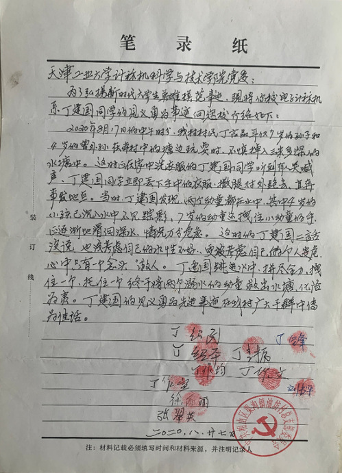 新学期开始,我校计算机科学与技术学院党委收到一封落款为“安徽省淮北市相山区渠沟镇油坊村”的来信。展开信件,落款处10个鲜红的手印,表达着内心深深的感激之情。经仔细阅读,得知这封信是特意感谢我校计算机专业2019级专硕研究生丁建国同学的,他曾于今年暑假在该村池塘救起两名落水儿童,其中男孩儿7岁、女孩儿4岁。