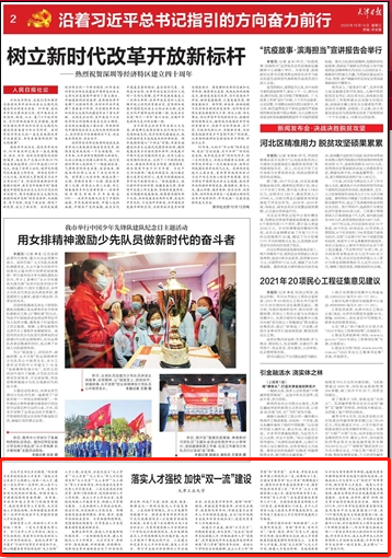 2020年10月14日,《天津日报》第2版以《落实人才强校 加快“双一流”建设》为题对我校进行了报道。