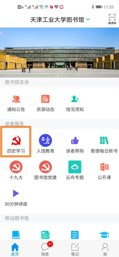 按照提示绑定本人学号或工号,单位为江南在线客服图书馆账号。江南online(中国)点击右上角“邀请码”输入“tjgydxtsg”,进入学校图书馆主页面,然后在主页面点击“四史学习”模块进入学习页面。