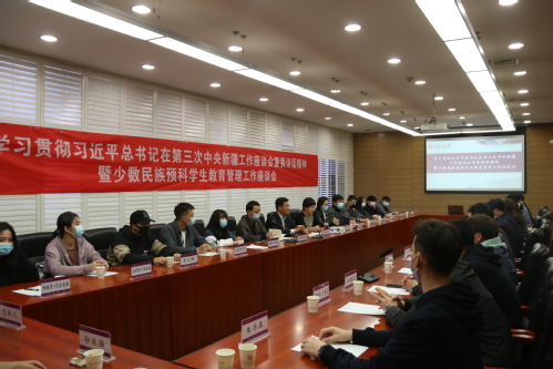 会上,党委统战部副部长韩旭彤领学并传达了习近平总书记在第三次中央新疆工作座谈会重要讲话精神;少数民族学生专职辅导员麦提托合提·如则分享了自己在党和政府的民族政策之下成长的经历、职业心路历程,表示要全力做好学校的少数民族学生教育管理工作,为学生做好服务、回馈社会;新疆少数民族学生代表、经济与管理学院研究生依明江·亚勒昆分享了自己读研以来的感受和担任预科学生班主任的工作经历,表示要发挥少数民族学生骨干作用,牢记一名学生党员的初心和使命;教务处副处长马涛介绍了少数民族预科学生教学管理工作情况和教学计划的安排;党委学工部副部长刘孜勤代表学工部汇报了我校预科学生思想与教育管理工作的基本情况和以后的发展规划。2018级预科学生代表、现经济与管理学院2019级学生阿迪拉·苏力塘和2020级预科学生代表南丁夫畅谈了自己在学校的学习、生活和成长的经历,表达了对党和政府的感恩之心和在大学继续奋斗拼搏的决心。