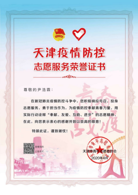 攻坚克难,共战疫情。疫情期间,尹浩霖同学积极投身社区执勤工作,累计服务时常400余小时,同时担任志愿汇平台的专业储备志愿者和消费扶贫志愿者,协助开展线上疫情防控工作;作为班长,组织班级同学捐款,鼓励同学参与家乡志愿服务活动,为打赢疫情防控阻击战,贡献自己的青春力量;作为预备党员,他积极响应党支部号召,参与支部组织的各种活动,通过线上线下的方式分享自己作为社区志愿者的经历,展示了一名学生党员的责任与担当!