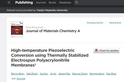 我校纺织科学与工程学院王闻宇副教授和林童教授(澳大利亚迪肯大学)课题组长期致力于能源纤维研究,成功构筑高性能聚丙烯腈纳米纤维压电材料,其研究成果先后于20192020年在Nano Energy杂志上发表。近期,课题组在前期工作基础上,进一步针对其超高温下压电性能进行了系统研究并取得了进展,相关成果以“High-temperature Piezoelectric Conversion using Thermally Stabilized Electrospun Polyacrylonitrile Membranes”为题,在国际期刊《Journal of Materials Chemical A》(影响因子为12.7)上发表,研究成果被推荐为该杂志最近一期的封面报道,王闻宇副教授与纺织科学与工程学院的博士生郑意德为该论文的共同第一作者。