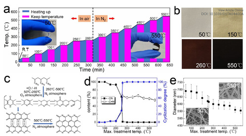 针对压电聚合物材料的技术瓶颈,课题组巧妙地从聚丙烯腈分子结构进行设计和调控,通过预氧化和去氢成环等一系列化学反应,控制反应进程,形成梯形分子结构,并将偶极性的分子基团定向地锁入梯形分子结构中,使聚合物不仅具有耐高温的特性,同时具有很高的压电特性,给高温环境下聚合物压电材料的设计和运用带来了曙光。相关测试表明,与常规压电聚合物材料相比,该材料从常温至550 的超高温环境范围下,依然能够产生稳定的电压输出(输出电压最高可达62 V),输出功率密度达264 W/m2,所产生的电能可以直接用于驱动微电子器件和储电元件中。