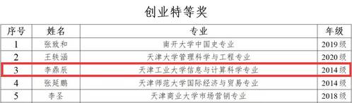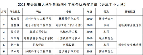 近日,天津市教育发展基金会公布了2021年天津市大学生创新创业奖学金获奖名单,我校纺织科学与工程学院2019级博士生高鲁获得创新奖学金特等奖,数学科学学院信息与计算科学专业2014级本科生李鼎辰获得创业奖学金特等奖。程金雪、齐鲁豫、温滨正3名同学获得创新奖学金优秀奖,宋兴辉、胡宇辉、朵永超3名同学获得创业奖学金优秀奖。