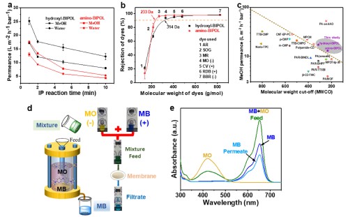 耐溶剂膜材料是有机溶剂纳滤技术的核心。针对现有有机溶剂纳滤膜普遍存在的溶剂渗透性差,分离精度低等挑战,研究团队从膜材料分子设计入手,首次合成了具有2,2'-联苯酚(BIPOL)刚性结构的两种小分子,采用易工业化的界面聚合制膜技术,制备了超薄无缺陷、且具有高微孔性的联苯酚耐溶剂纳滤膜(~5 nm),用于有机溶剂体系的筛分。所研制的联苯酚耐溶剂纳滤膜具有超高的甲醇渗透系数(13~17.5 LMH/bar),且较低的截留分子量(~233 Da),显著优于目前文献报道的有机溶剂纳滤膜的筛分水平。令人兴奋的是,该聚联苯酚纳滤膜可以实现分子量、尺寸相近的甲基橙(MO, 327 Da)和亚甲基蓝(MB, 320 Da)的精准筛分,其分离机理为尺寸排阻与道南效应的共同作用。研究团队所研制的聚联苯酚纳滤膜具有规模化放大生产的潜力,在特种分离如药物分子精准分离方面有巨大的应用前景。