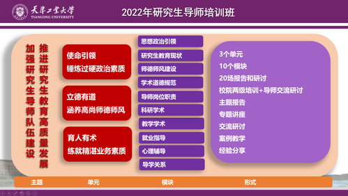 据悉,该系列培训共有3个单元、10个模块、20场报告和研讨,采用“校两级培训+导师交流研讨”方式进行,包括主题报告、专题讲座、交流研讨、案例教学和经验分享等形式,培训对象为在岗所有研究生导师,培训时间为202210311215日。(审稿:研究生院 肖志涛 编辑:党委宣传部 李焕峰)