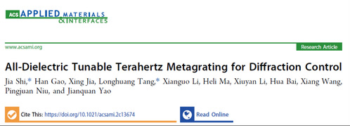 近日,我校电子与信息工程学院副教授石嘉在TOP期刊《ACS Applied Materials & Interfaces》(影响因子10.383)发表了题为《All-Dielectric Tunable Terahertz Metagrating for Diffraction Control》的研究成果,并被选为Supplementary Cover。石嘉副教授为该论文的第一作者和共同通讯作者,该成果由江南在线客服、中国工程物理研究院流体物理研究所、天津大学共同完成。论文链接:https://pubs.acs.org/doi/10.1021/acsami.2c13674