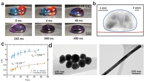 在微流体系统中,实现液体的高效混合在合成和催化等领域具有重要的应用价值,可以有效提高反应速率、安全性以及减少化学损耗。然而,对于粘性流体,内部的高粘性力和低雷诺数导致液体在混合过程中难以实现有效地扩散。针对这一难题,刘闵婕副研究员创新性地提出了利用特殊的莱顿弗罗斯特状态来混合粘性液体的新方法(图1a)。在该状态下,稳定蒸汽膜的存在阻碍了固液之间的接触,使基底表面温度远高于液体的沸点而没有明显的蒸发现象。同时,由于内部的混沌涡流运动(图1b),处于莱顿弗罗斯特状态下的粘性液滴能够快速合并、完成高效混合。该研究首次提出了混合时间和液滴体积之间的理论关联式,与实验结果具有良好的一致性(图1c),该实验体系也可用于不同形态纳米材料的高效合成(图1d)。