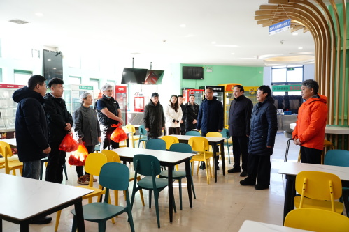 沈江书记一行先后走访了学校值班室、国际学术交流中心、监控室及微型消防站、兰缘食堂、A区设备站、留学生公寓。每到一处,校领导都与值班人员亲切握手交谈,详细了解各部门值班值守和后勤保卫等工作开展情况。“大家辛苦了!”“过年好!”“感谢大家的坚守,向家人问好。”校领导对值班人员在节假日为学校安全保驾护航、默默的付出给予高度肯定和赞扬,并送上了暖心的祝福和慰问品。