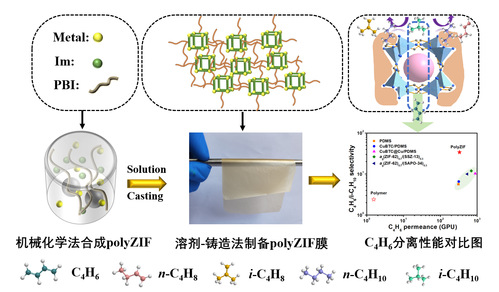 图1 polyZIF材料合成,polyZIF膜的大面积制备及C4H6膜分离性能对比图