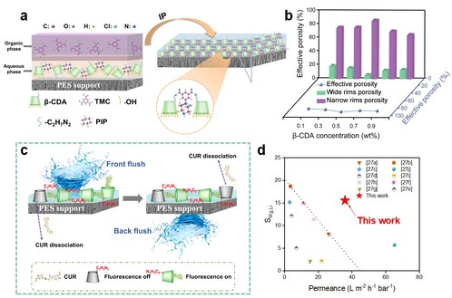 图(a) 有序孔道纳滤膜的制备示意图;(b) 不同环糊精浓度下纳滤膜的取向和孔隙率;(c) 定量表征纳滤膜孔道取向的机理示意图;(d)文献报道与本工作的性能对比图。